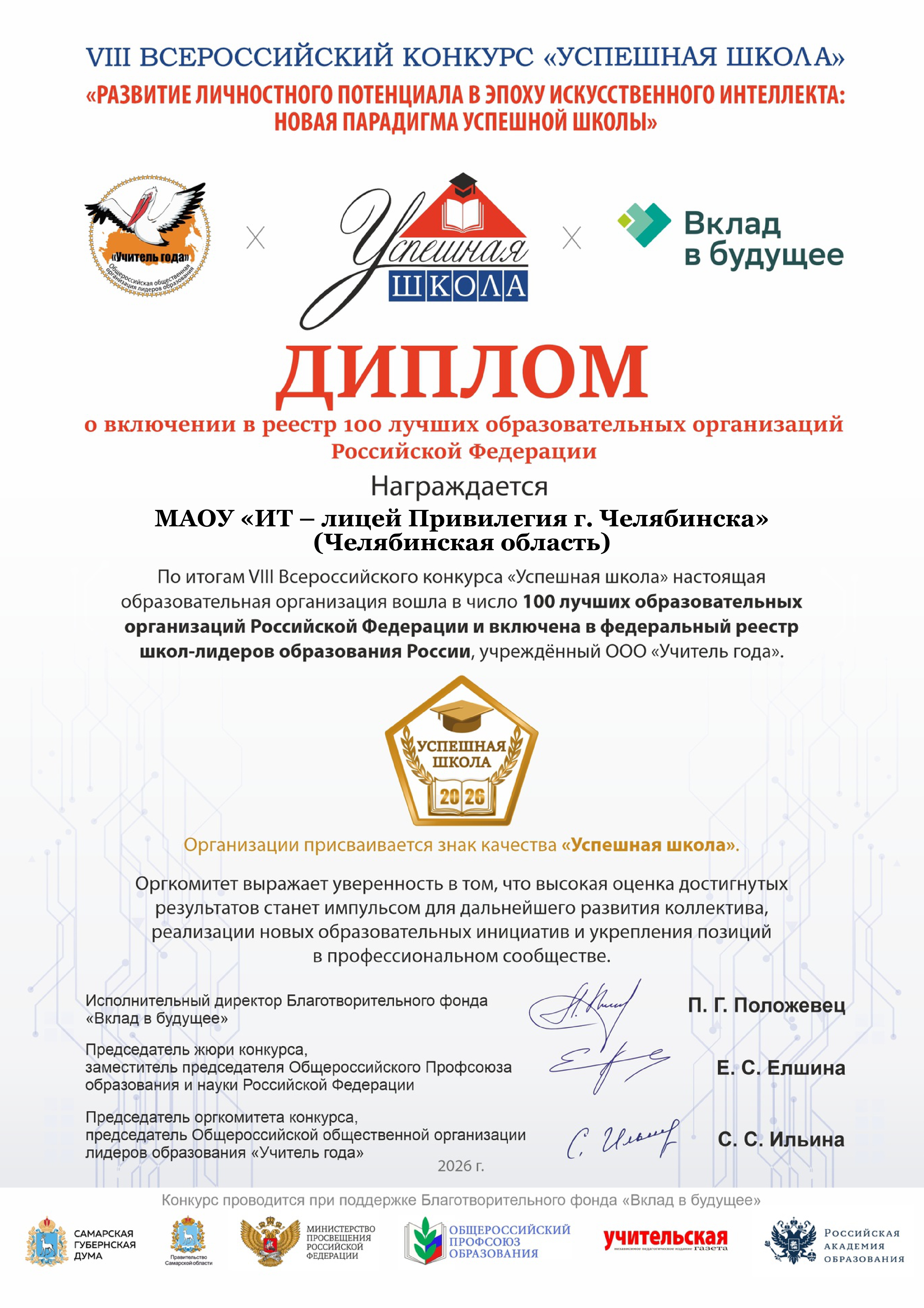 ИТ-лицей «Привилегия» (Челябинск) стал победителем VIII Всероссийского конкурса «Успешная школа» и включен в федеральный реестр 100 ведущих образовательных организаций РФ.