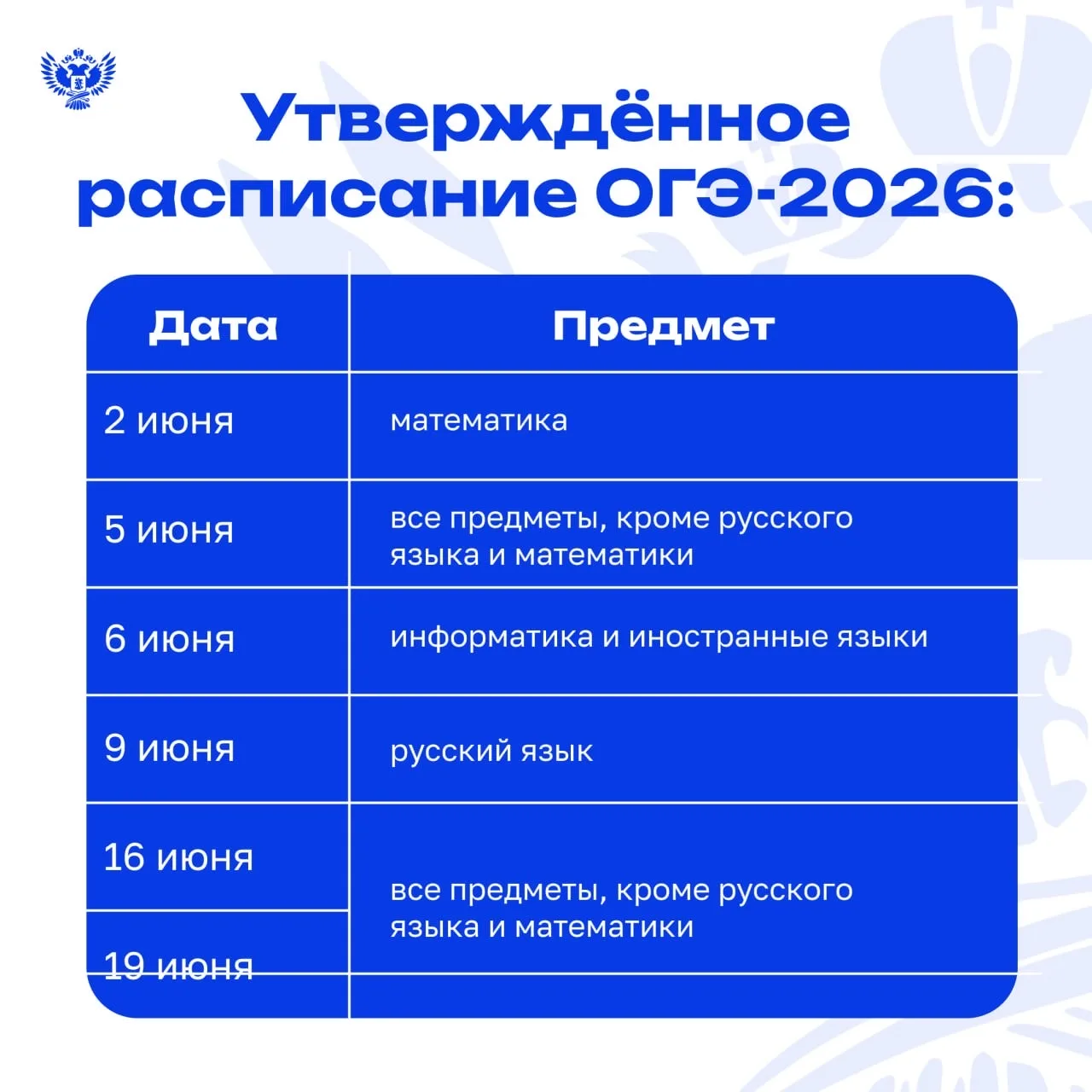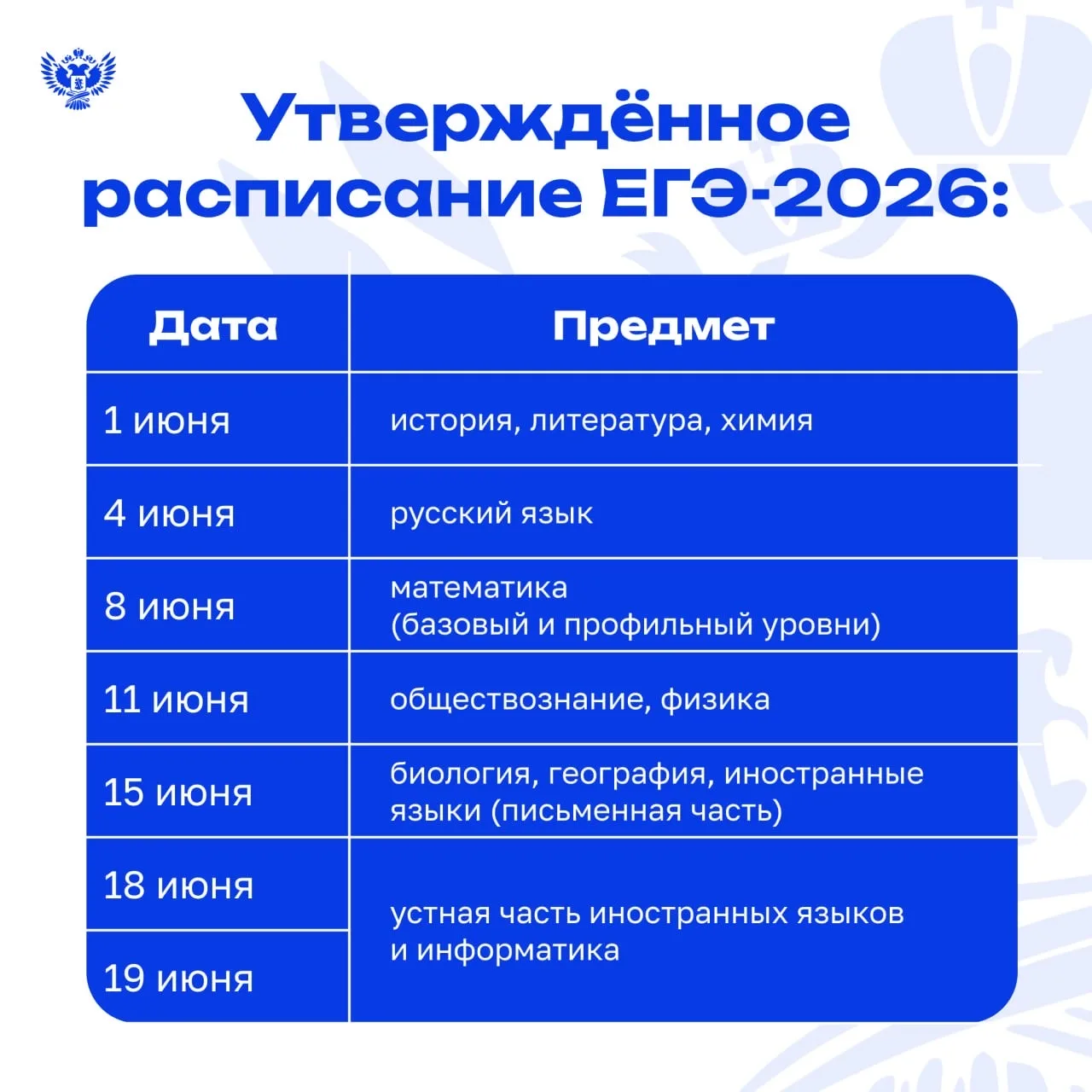 Совместными приказами Минпросвещения России и Рособрнадзора утверждено расписание единого государственного экзамена (ЕГЭ), основного государственного экзамена (ОГЭ) и государственного выпускного экзамена (ГВЭ) на 2026 год.