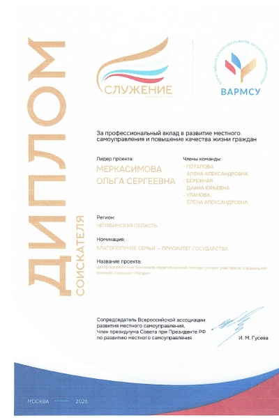 В номинации «Благополучие семьи – приоритет Государства» представлен проект «Центр комплексной психолого-педагогической помощи семьям участников СВО «Ресурс» (лидер проекта – Ольга Меркасимова, директор Центра психолого-педагогической, медицинской и социальной помощи Калининского района города Челябинска).